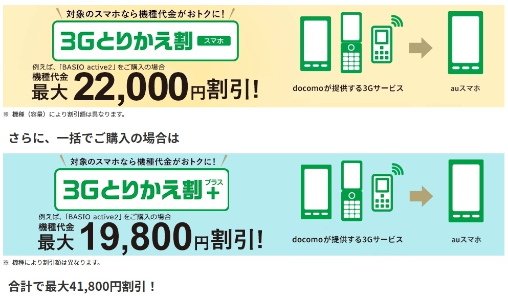 | 適用条件 | docomoが提供する3Gサービスから乗り換える対象のauスマホを購入 |