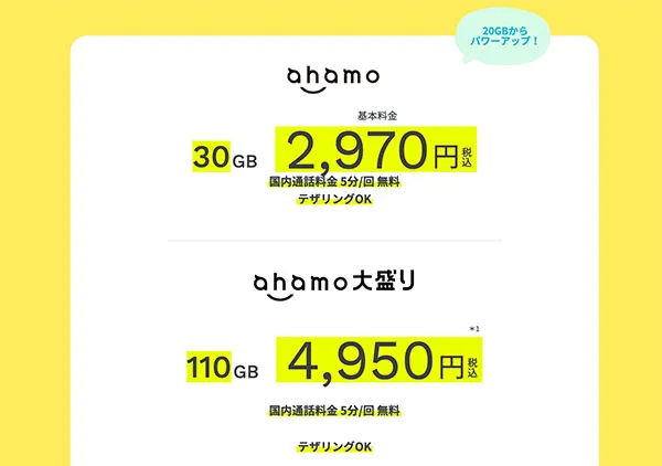 ahamoは、月額2,970円で30GB、月額4,950円で110GBが利用できるシンプルでコストパフォーマンスの高いプランです。
