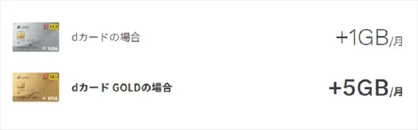 | 特典内容 | dカード払い:毎月1GB増量 dカード GOLD払い:毎月5GB増量 |