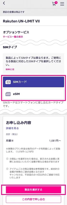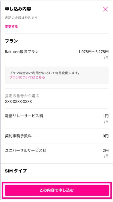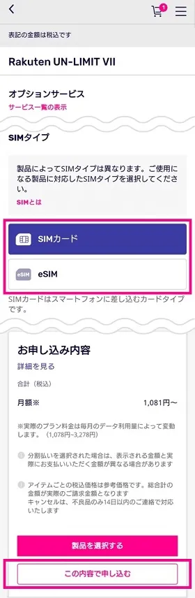 SIMタイプを、SIMカードまたはeSIMのどちらかで選択し、契約内容に間違いがなければ「この内容で申し込む」をタップしてください。