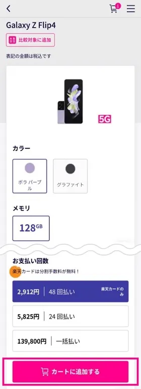 ご希望のカラー、メモリ容量、お支払回数を選び、「カートに追加する」を押してください。 スマホ購入