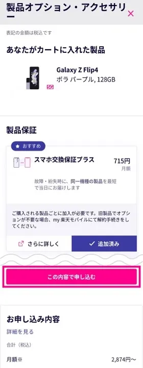 製品保証や関連アクセサリーが必要な場合は選択し、「この内容で申し込む」をタップしてください。