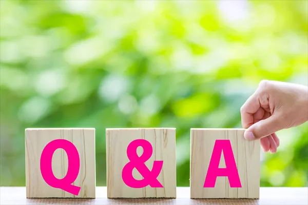 ピンク色でQ&Aと書かれた積み木を掴む手