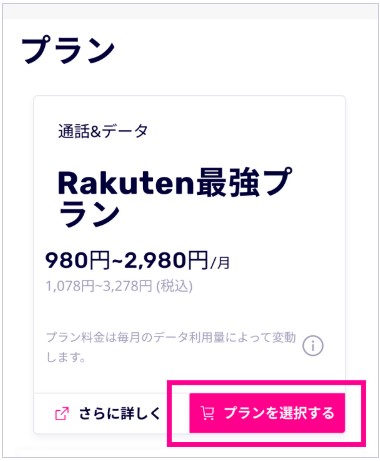 楽天モバイルで提供されている「Rakuten最強プラン」の画面が表示されますので、「プランを選択する」をタップしてください。