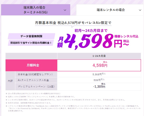 | 1か月の 端末レンタル代 | 8,947円~ | 8,448円 |