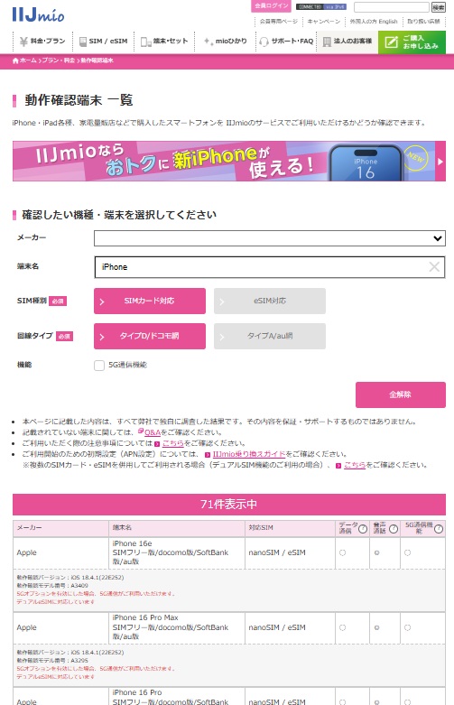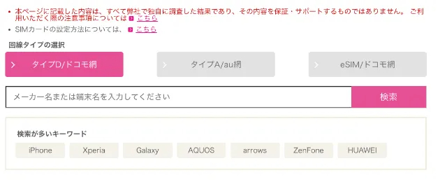 この場合は回線タイプを「タイプD/ドコモ網」を選択し、検索窓に「iPhone」と入力してみてください。すると次のように表示されます。
