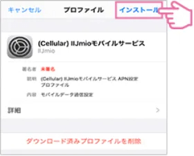 6. プロファイルのページが開いたら、「ダウンロード済プロファイル」にある「(Cellular)IIJmioモバイルサービス」をタップしたのち、右上にある「インストール」を選択してください。