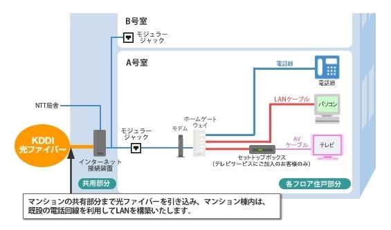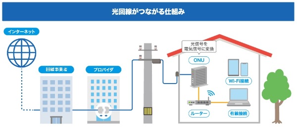 光回線では有線の光ファイバーをアパート内に引き込んで直接つなぎ、インターネットを接続します。
