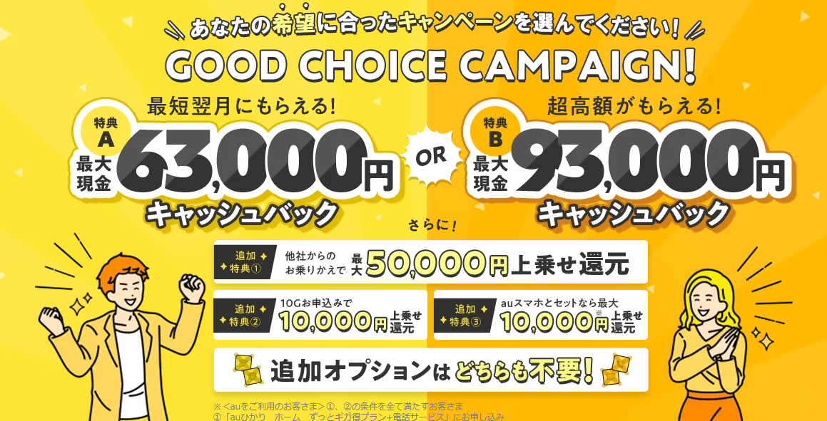 | 詳細 | プランA:93,000円 プランB:63,000円 | 最短翌月 | 開通工事費実質無料 au・UQモバイルとのセット割 | |