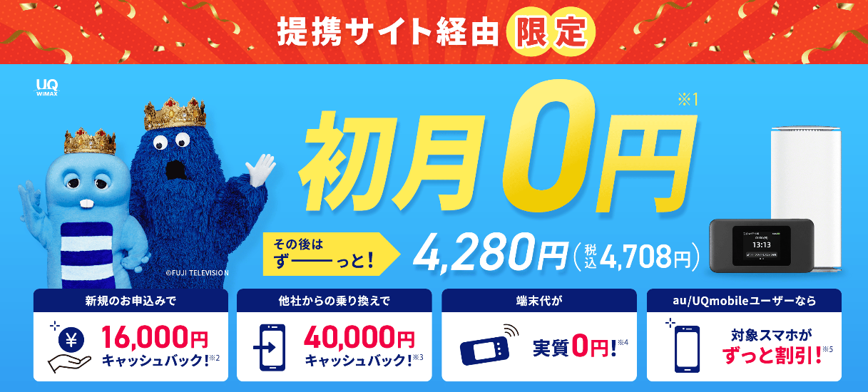 | 詳細 | 40,000円 | 2か月後 | 開通工事費実質無料 ソフトバンク・ワイモバイルとのセット割 | |
