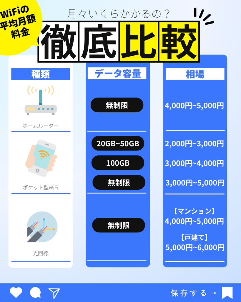 一人暮らしのWiFiの相場はホームルーター・ポケット型WiFi・光回線によって異なりますが、平均すると5,000円前後が目安です。