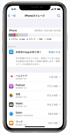iPhoneのストレージ容量が十分かを確認します。移行元の旧iPhoneより移行先の新iPhoneのストレージ容量が小さいと、容量が足らないので移行できません。