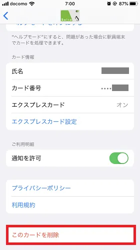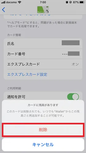 まずは、新しいiPhoneに移行するために、古いiPhoneでSuicaの情報を削除します。