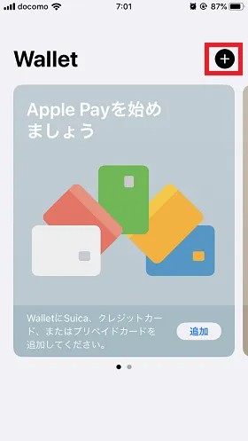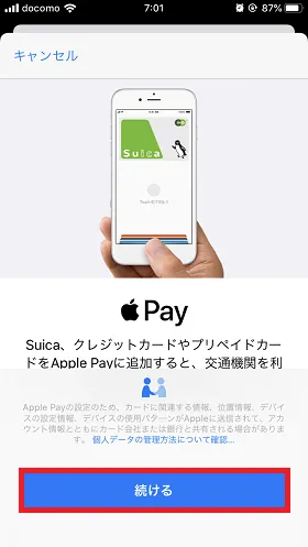 「Wallet」アプリを開き、画面右上にある「+」から、Apple Payの画面が表示されるので「続ける」を選択します。