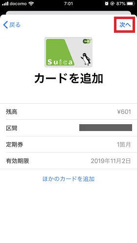 「カードの種類」で「Suica」を選ぶと、Suicaに登録した氏名と残高が表示されるので、右上の「次へ」を選択。