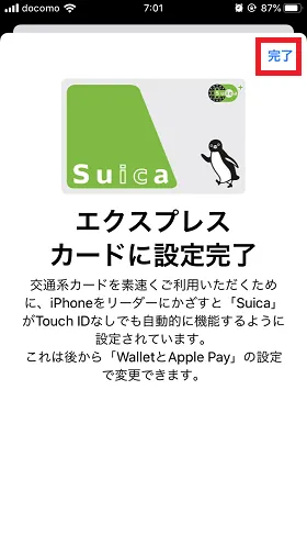 最後に「エクスプレスカードに設定完了」で、Suicaの移行が完了します。