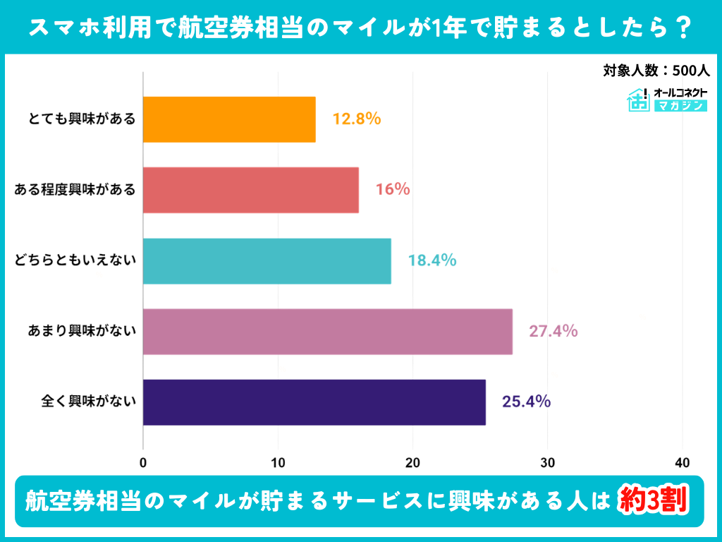 通信サービス利用者500人に対し、「スマホ利用で航空券相当のマイルが1年で貯まるとしたら?」という質問をしたところ、興味がある人は全体の約3割に留まる。