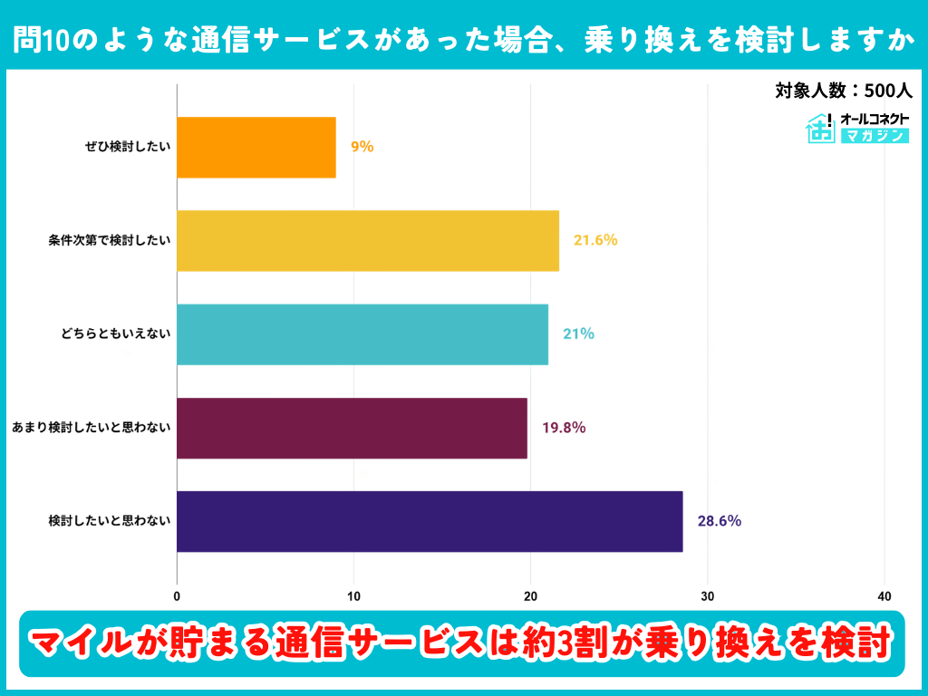 また、「スマホ利用で航空券相当のマイルが1年で貯まる通信サービスがあった場合、乗り換えを検討しますか?」という質問に対しては約3割の人が検討する可能性があると分かる。