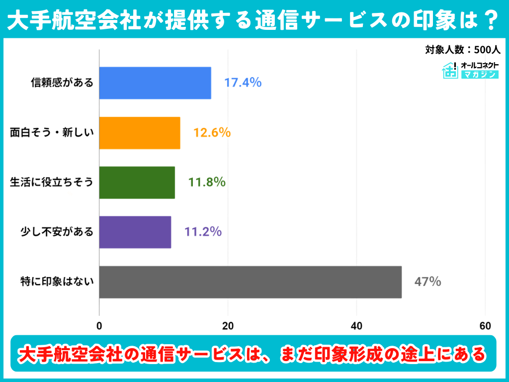 「大手航空会社が運営する通信サービスの印象」についてアンケートを取ると、印象があると答えた人の中では「信頼感がある」がもっとも多くなった。