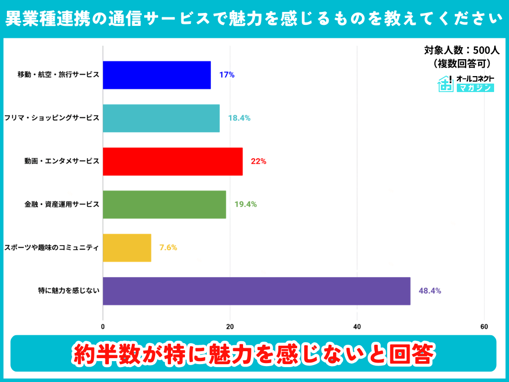 また、通信サービスユーザーに「異業種連携の通信サービスで魅力を感じるものを教えてください」という質問をしたところ、「移動・航空・旅行サービス」は全体の17%と比較的低い水準となった。
