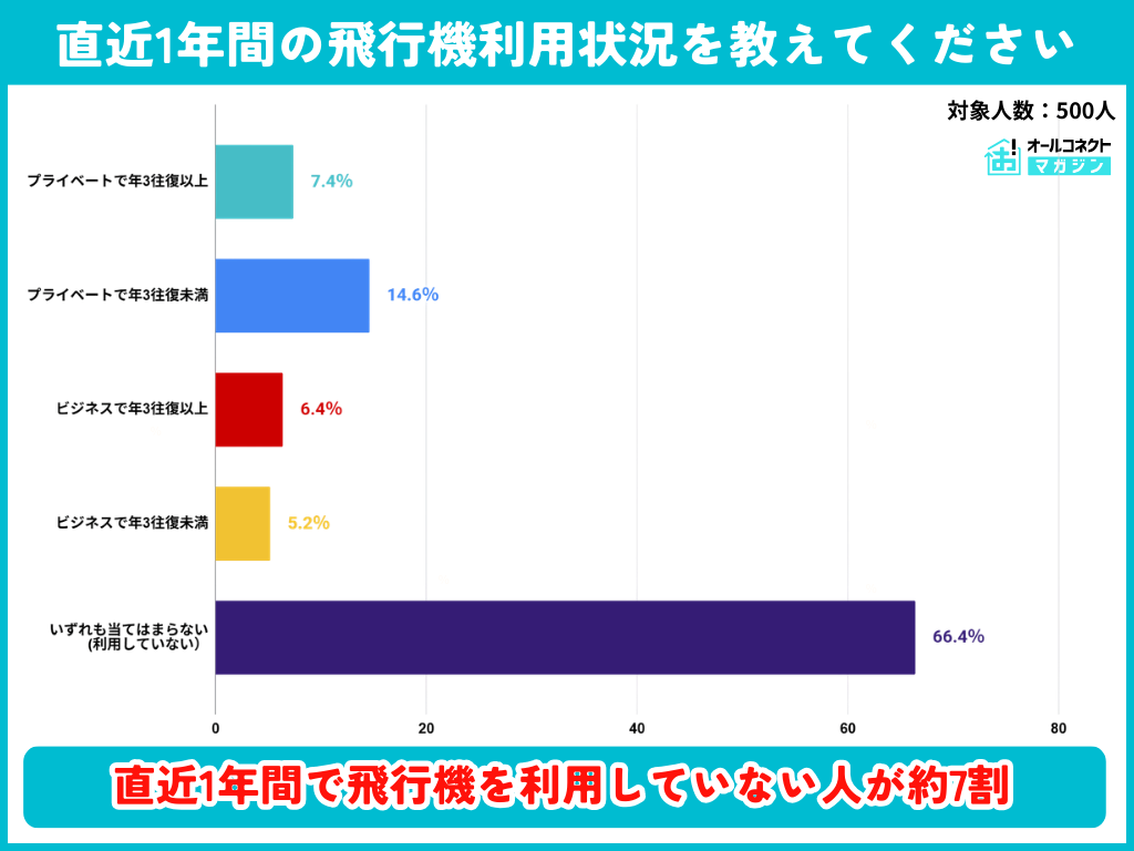 しかし、アンケートに回答した500人のうち航空機の利用率もあわせて確認すると、「直近1年間で飛行機を利用した人は全体の約3割」しかいない。