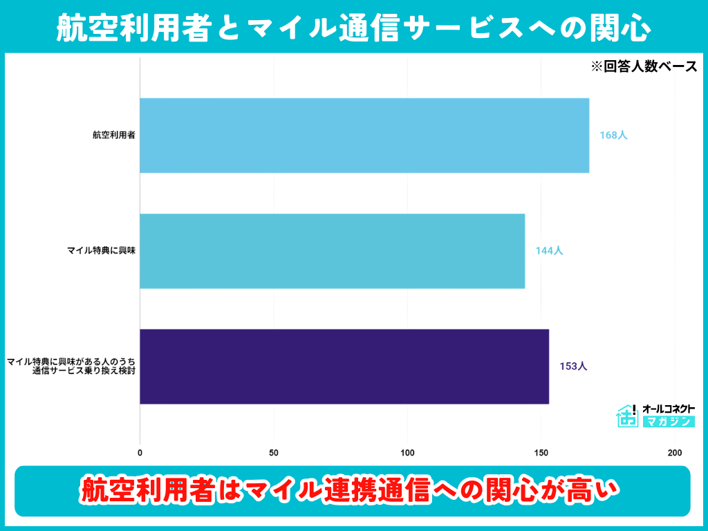 また、航空機利用者168人をベースにすると、マイルが貯まる通信サービスへの乗り換えを153人が検討する可能性があるということだ。