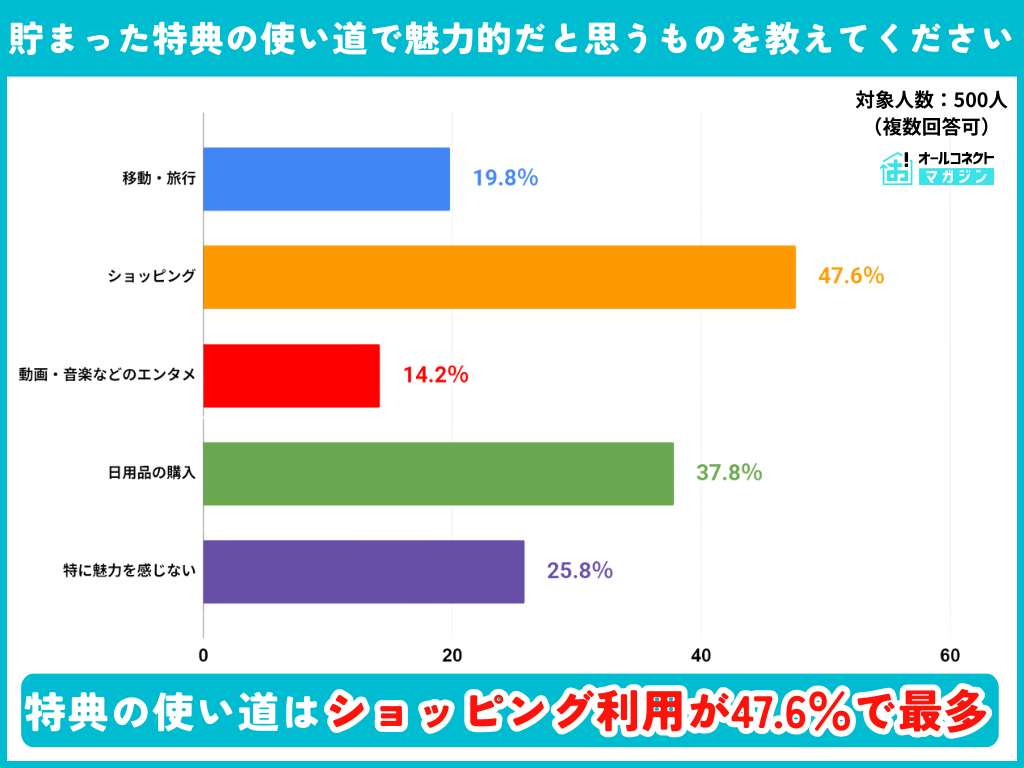 さらに、スマホで貯まる特典の使い道について、日常生活に直結するショッピングや日用品の購入に次いで移動・旅行を選ぶ人も一定数いるため、潜在的なニーズも今後さらに高まる可能性はある。