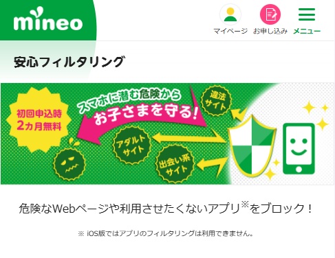 MVNO でもキャリアと同様に フィルタリングサービス提供が義務化 されています。SIM契約時にオプションを付与するか、iOS/Android の「保護者による使用制限」を併用することで、Webサイトやアプリの制限・利用時間の管理が行えます。