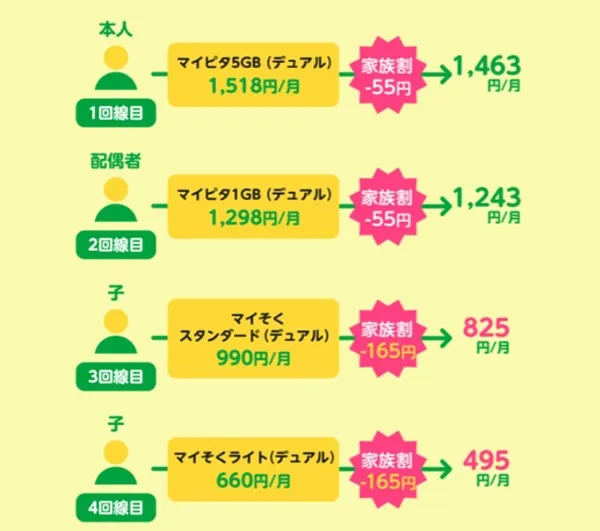 | 家族割適用後 の月額料金 | 1,265円 | 2,915円 | 4,015円 | |
