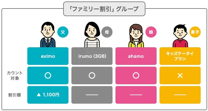親回線のデータをシェアするようなシェアプラン契約時では、子回線分が家族割の対象とならない場合があるので、事前に適用条件を確認した上で契約してください。