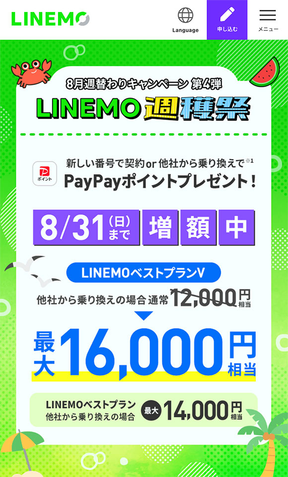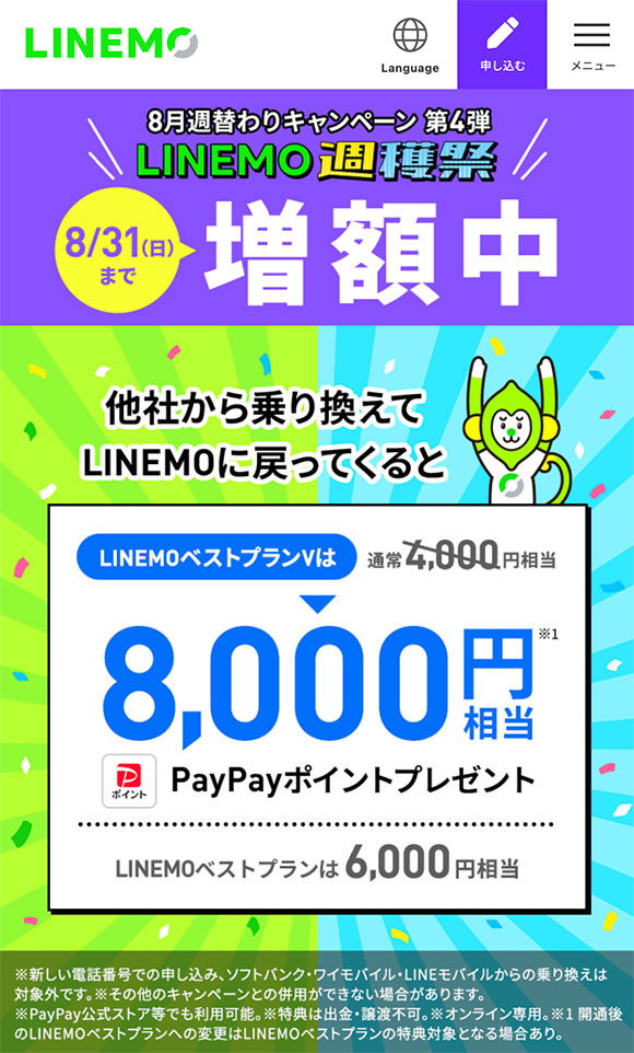 このキャンペーンは、他社からの乗り換えや新規契約時に適用でき、公式キャンペーンページから「LINEMOベストプラン」または「LINEMOベストプランV」に申し込むことで、PayPayポイントがプレゼントされます。