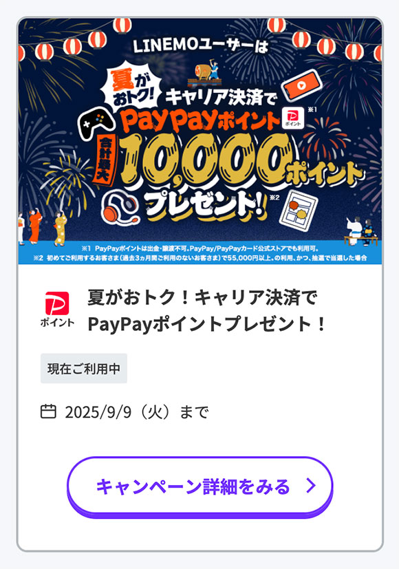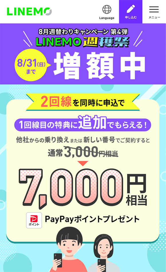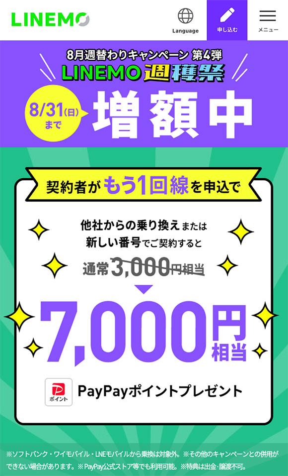 | 契約者向け! 追加申込キャンペーン | キャンペーンページから、新規または乗り換えでLINEMOを追加契約する現LINEMOユーザー | 7,000円相当のPayPayポイントをプレゼント 2025/8/31まで増額中 |