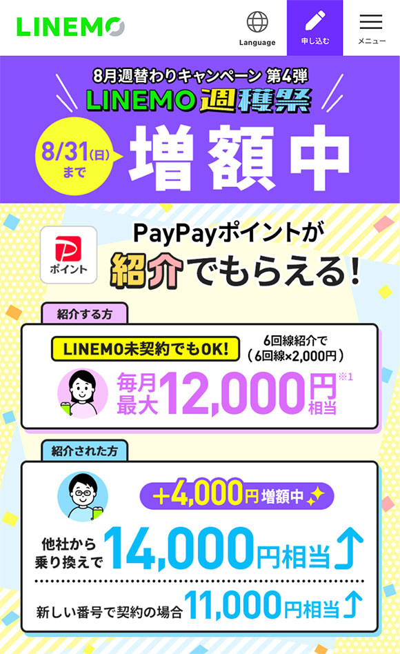 | LINEMOベストプラン紹介キャンペーン | LINEMOを紹介した人(LINEMO未契約でも可) LINEMOを紹介されて契約した人 | 紹介した人は2,500円相当×最大4回線分、紹介されて契約した人には最大14,000円相当のPayPayポイントをプレゼント 2025/8/31まで増額中 |