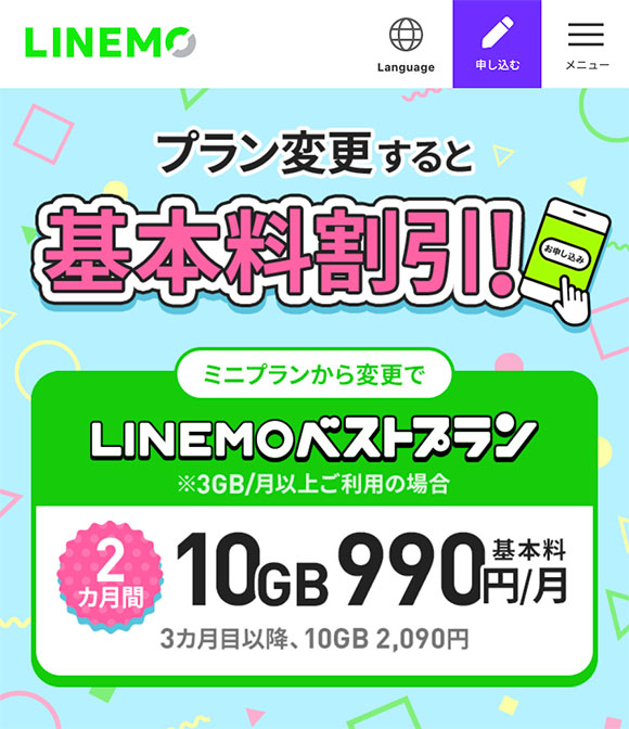 | プラン変更で月額基本料割引キャンペーン | 「スマホミニプラン」から「LINEMOベストプラン」へプラン変更する人 | 2か月間、3GB以上消費した月は1,100円割引 |