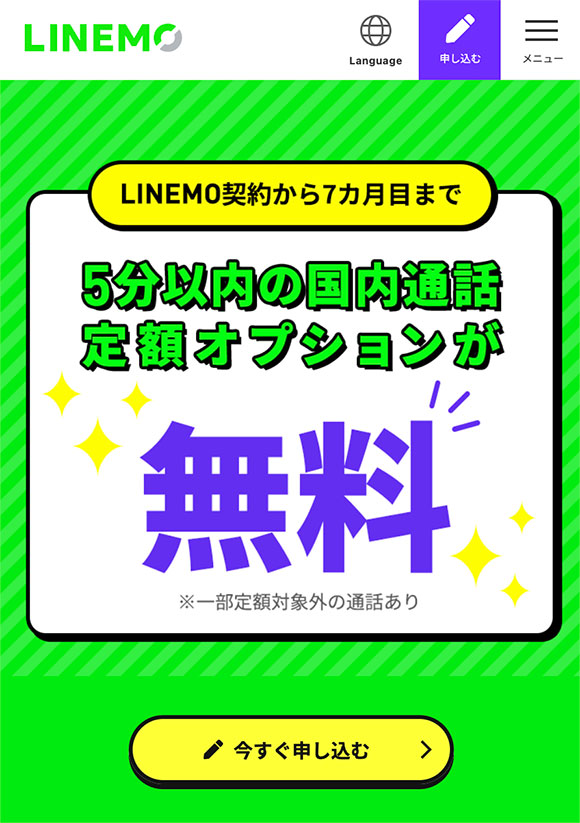 | 【ソフトバンク・ワイモバイルからの乗り換え限定】 基本料初月0円特典 | ソフトバンクまたはワイモバイルからLINEMOへ乗り換える人 | 料金プランとオプション料金が初月無料 |