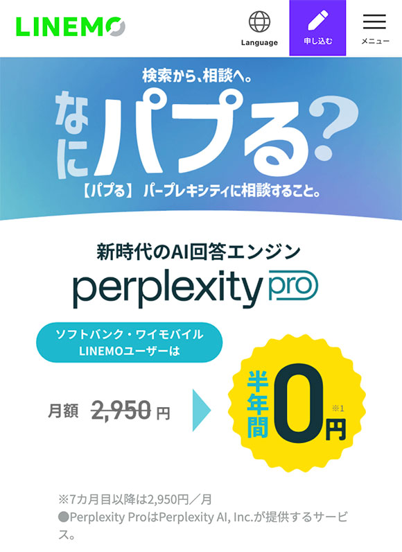 | Perplexity Pro 半年間無料 | 「Perplexity Pro」を契約するLINEMOユーザー | 専用フォームから「Perplexity Pro」を契約すると、「Perplexity Pro」の料金が半年間無料 |