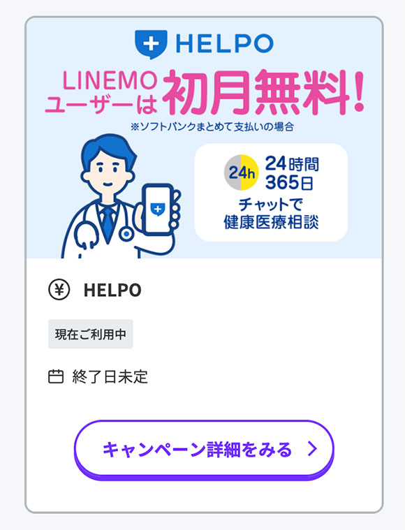 | HELPO | 「HELPO」を新規契約し、支払い方法を「ソフトバンクまとめて支払い」に設定したLINEMOユーザー | HELPO利用料が初月無料 |