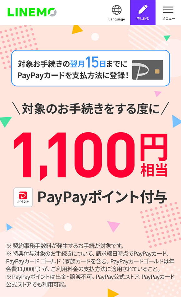 | 契約事務手数料特典(PayPayカード支払い) | LINEMOの支払方法に「PayPayカード」または「PayPayカード ゴールド」を設定する | 対象の手続きごとに1,100円相当のポイント付与 |