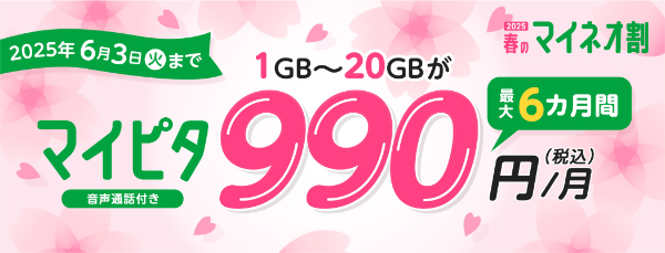 マイピタ1~20GB 最大6カ月間990円キャンペーン