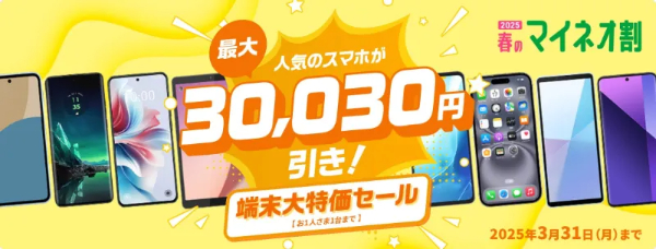 | 特典内容 | 端末と回線を同時購入で人気スマホが最大30,030円割引 |