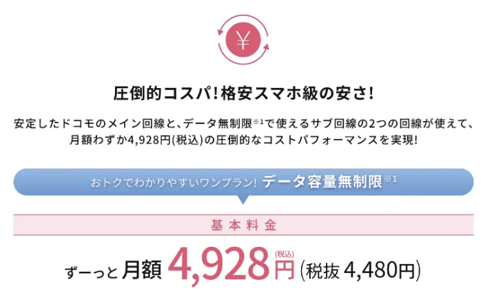 月額4,928円(税込) で「無制限回線+ドコモ回線」の2つの回線を組み合わせた独自プランを提供し、大手キャリアの半額圏で“安さと安心”を両立します。
