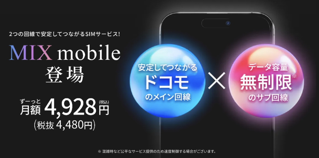 MIXmobile(ミックスモバイル)は、従来は通信に詳しいユーザーしか実現できなかった「安さと安心を両立したデュアルSIM運用」を、ひとつのシンプルなプランとしてパッケージ化したサービスです。
