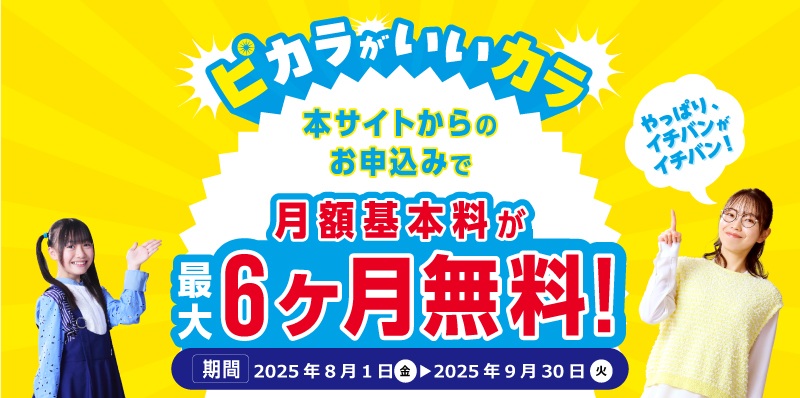 →期間中公式サイトからの新規お申込みでピカラ光が最大6ヶ月無料 - サクサク快適!10Gキャンペーン(~2025年9月30日)