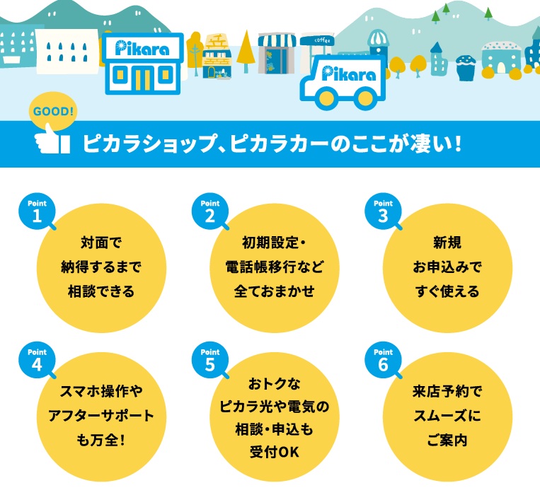 ピカラモバイルでもその知見を活かし、格安スマホ他社にはあまりない実店舗(ピカラショップ)や移動店舗(ピカラカー)によるサポート体制を整えていきました。