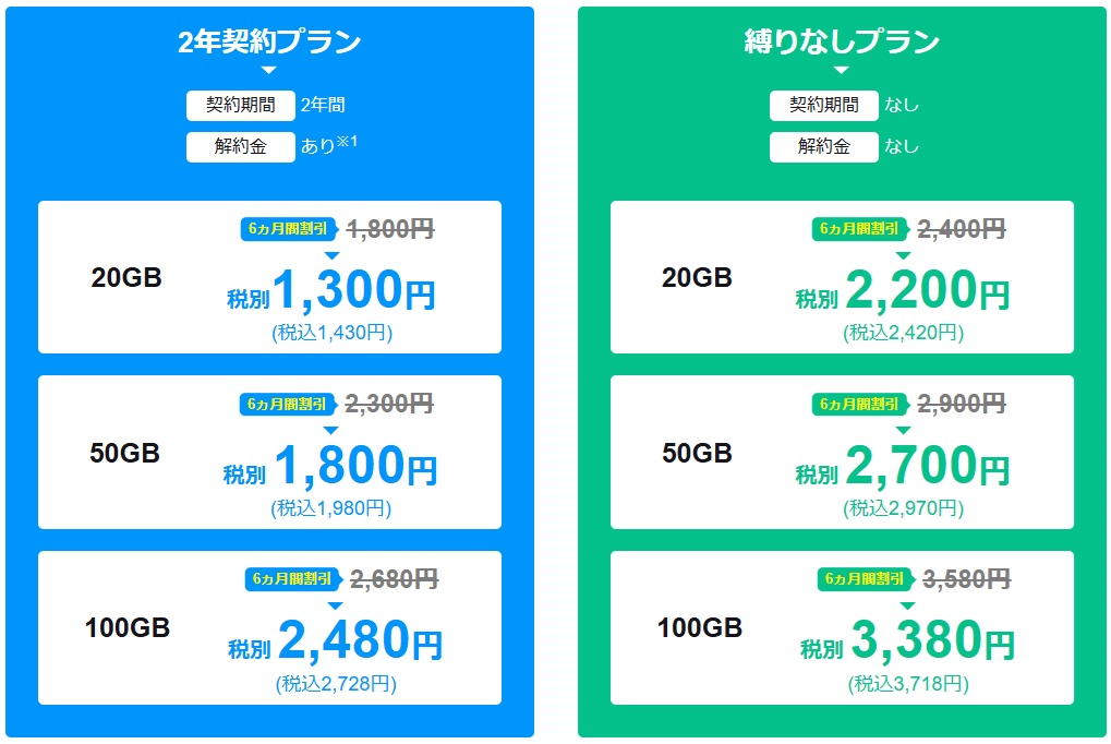 | 月額料金 | 20GB:1,980円 →6か月間1,430円 50GB:2,530円 →6か月間1,980円 100GB:2,948円 →6か月間2,728円 | 20GB:2,640円 →6か月間2,420円 50GB:3,190円 →6か月間2,970円 100GB:3,938円 →6か月間3,718円 |