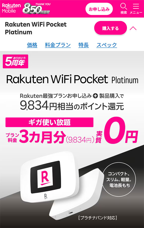 口座振替に対応しているポケット型WiFi一例- 楽天モバイル