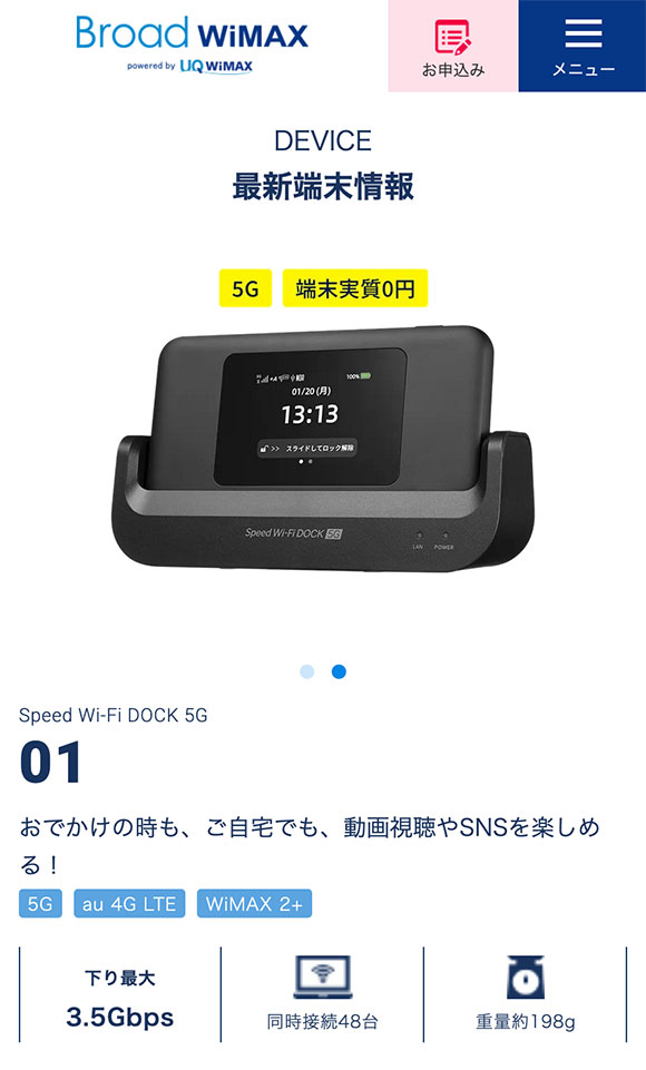 | Broad WiMAX | 1,800円 | 37,000円 キャッシュバック または他社違約金負担 | 初月:0円 1か月目以降:4,708円 | 150.65Mbps |