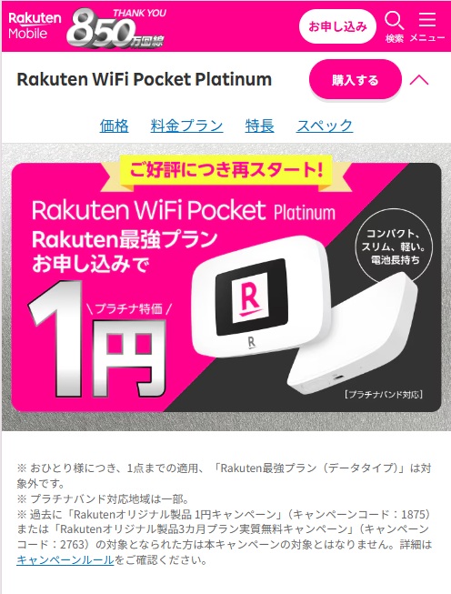 楽天モバイルのポケット型WiFiは事務手数料が0円、さらに楽天最強プラン加入で端末料金が1円になりますす。