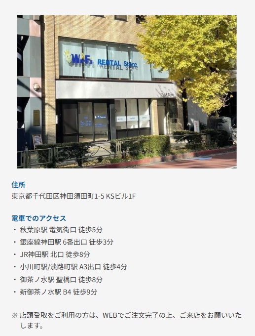 ![]() ![]() WiFiレンタルどっとこむ | 店舗受取 | 平日:10 時~18 時 |