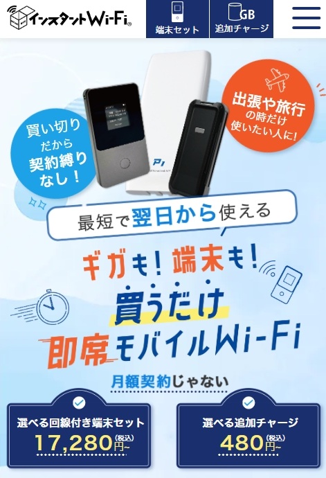 ![]() ![]() インスタント Wi-Fi | 30日間 | 3,580円 | ー | 3,180円 | 2,580円 | ー | 1,480円 | 980円 | ー | ー |